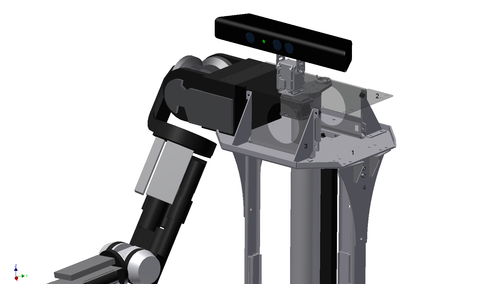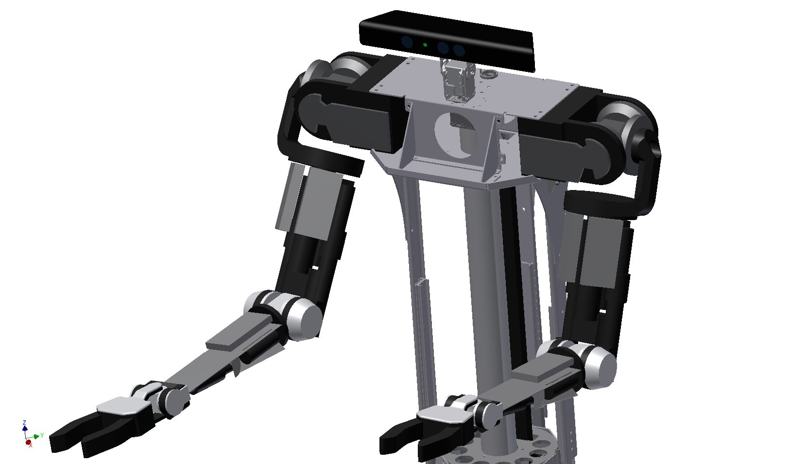 The shoulders are connected to the base platform via a spindle that allows the upper part of the body to move up and down. In its lowest position, AMIGO is capable to lift objects from the ground. While in its highest position the robot is about as high as a kid, making it big enough to place objects on the table or in the sink but still small enough to make a friendly appearance.