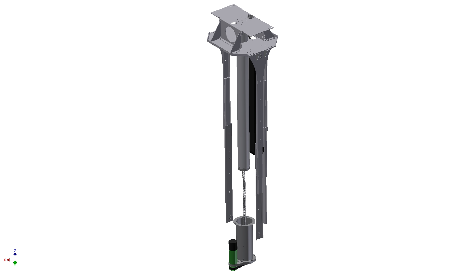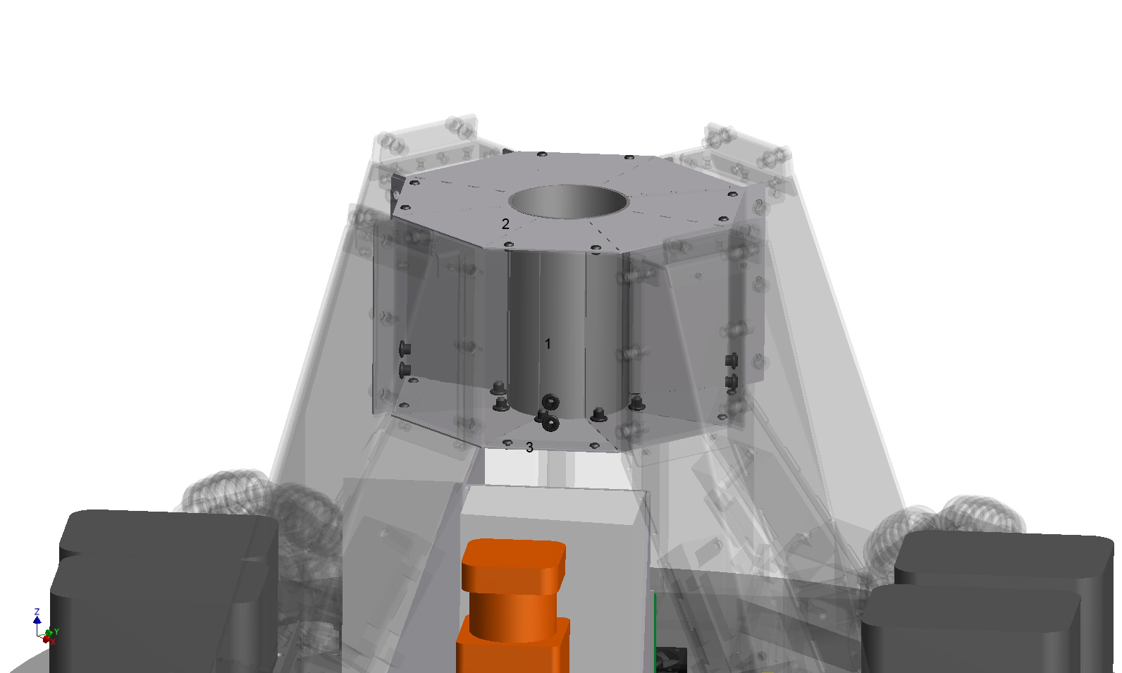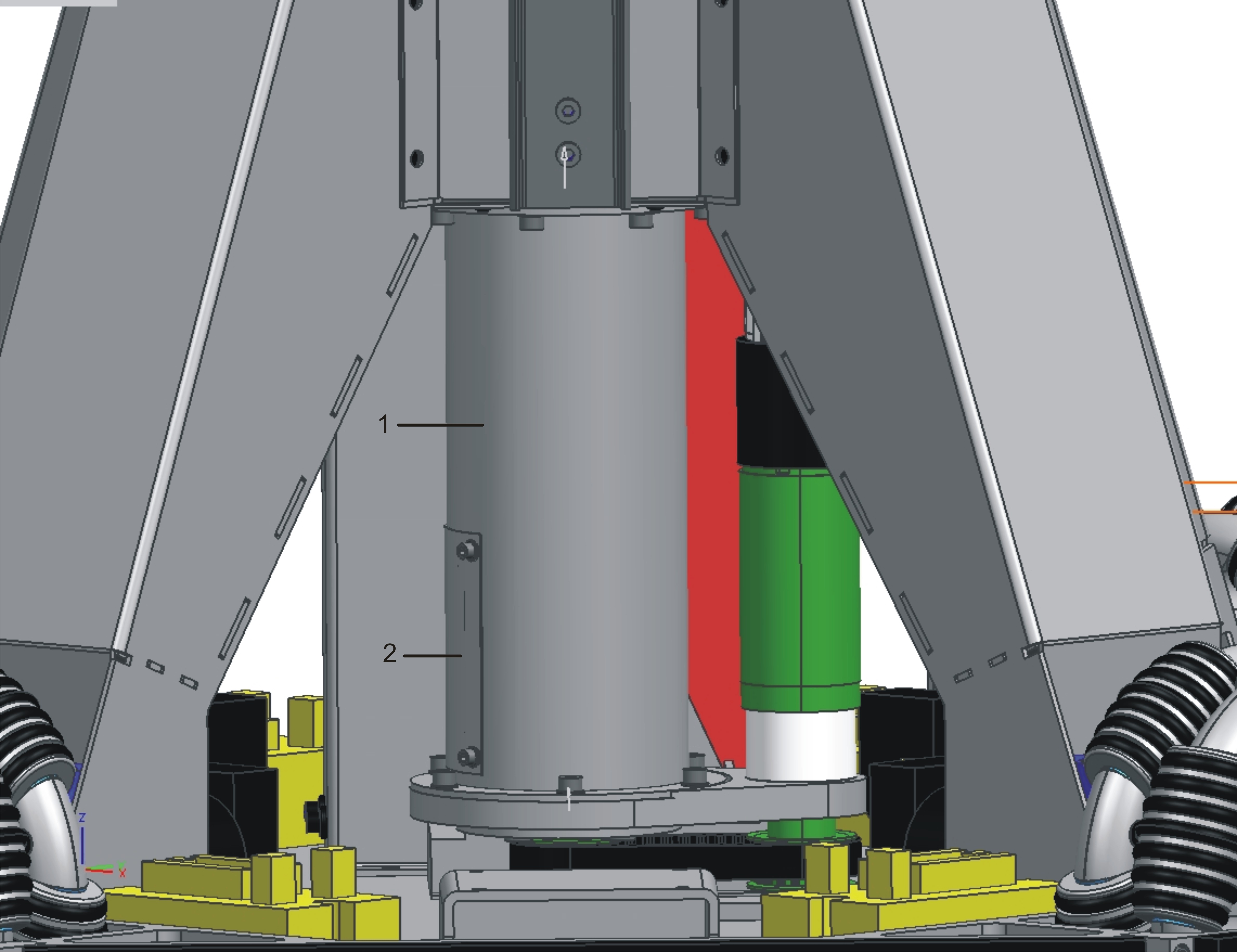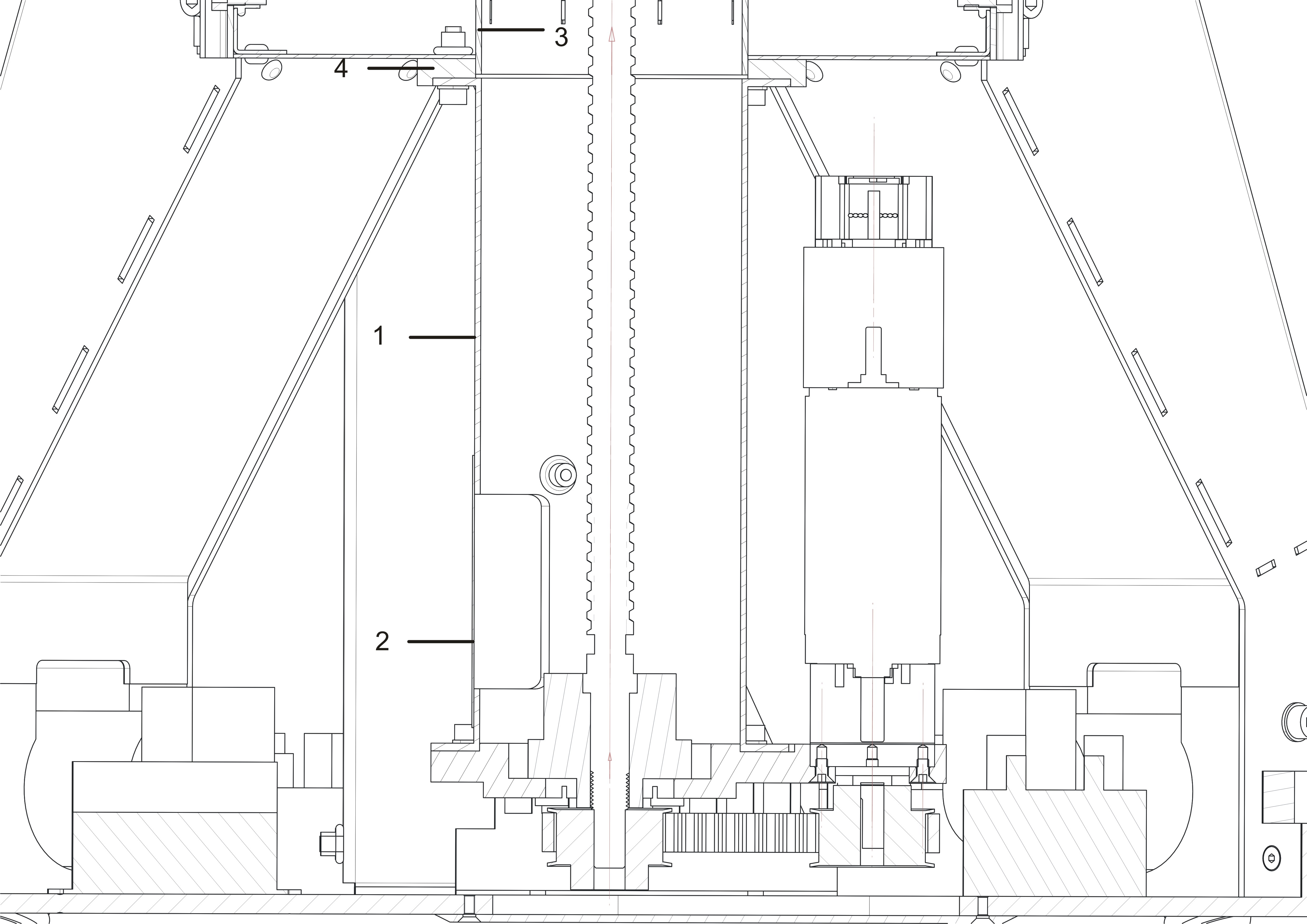 Figure 7 shows the connection between the lifting mechanism and the rest of the frame. The connection is made by an aluminum tube (1) with two flanges. The tube is a standard MCB part. It has an outer diameter of 70 mm and a wall thickness of 1.5 mm. The flanges are 2 mm thick and are welded to the tube. A hole is made in the tube to access the components inside. The hole is covered by a cover plate (2) that is bolted to the tube. Figure 3 shows a cross section view of the connection. The tube (1) and cover (2) can be recognized in this Figure. Figure 4 shows that the tube is centered on the motor_spindle_support and on the tube of the central box (3). To center the connecting tube on the tube of the central box an extra body (4) is used, which is also made out of aluminum. The tube (3) is four millimeter longer than the height of the central box. The extra body (4) is centered on this extra part of the tube. The flange of the connecting tube (1) is centered on the extra body. The connecting tube and the tube of the central box do not touch each other. This ensures a good alignment of the spindle with respect to the central box. Both parts are bolted to the central box with 8 M4 bolts.