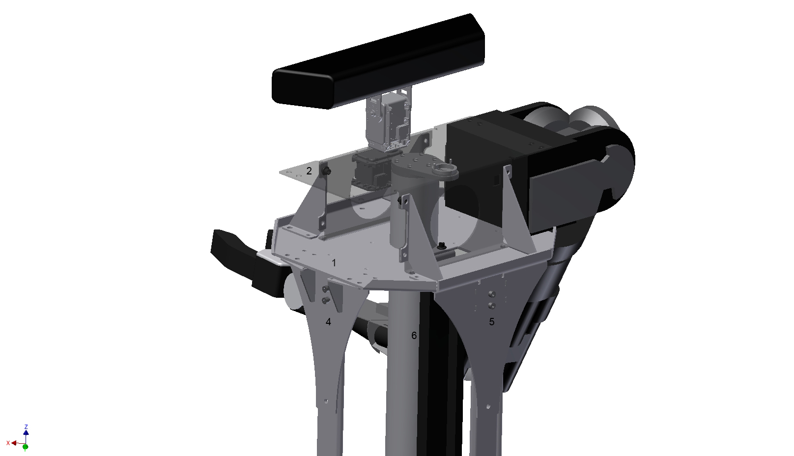 Figure 2 and 3 shows the upper body of Amigo. The upper body consists of a three millimeter aluminum base plate (1). It has an octagonal shape and six of its edges are folded to increase the out of plane bending stiffness of the plate. The flanges are welded together at the points were they meet. A U-profile (2) (made transparent to give a better view) is bolted to the base plate. The profile is folded from a two millimeter thick aluminum plate. The cross section of the profile is fixed by four triangular sheets (3) of 2 millimeter thick aluminum, which are bolted to both the u profile and the bottom plate. The U-profile is not welded to the bottom plate, so it can still easily be disassembled to access the electronic components that are located inside the box.