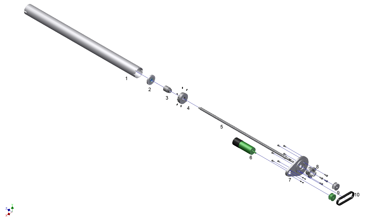 AMIGO’s upper body is lifted by a ball screw spindle mechanism. An exploded view of this mechanism is depicted in Figure 6. One end of the spindle (5) is supported by an axial support (8) and the other end by a deep groove roller bearing (2). A teflon ring is placed around the bearing to reduce the friction between the bearing and the tube it slides through. The outer shape of the nut (3) is adjusted by screwing it in an extra connector (4). The tube is connected to this connector with 6 M4 set screws. The connector is a milled aluminum part. The tube is a standard aluminum tube from MCB with and outer diameter of 50 mm and a wall thickness of 1.5 mm. The axial support is bolted to the motor spindle support (7) with 4 M4 bolts. This support is a milled aluminum part. Also the motor assembly (7) is bolted to this support with 4 M3 counter sunk bolts. The power from the motor is transferred to the spindle via a tooth belt drive train (9) (10).