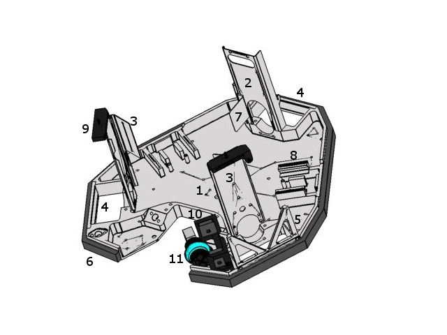 Finally, two ball holders (11) are assembled on the front of the base plate, which is already part of the ball handling mechanism. The ball holders will be discussed in the Ball Handling and Kicking Mechanism section.