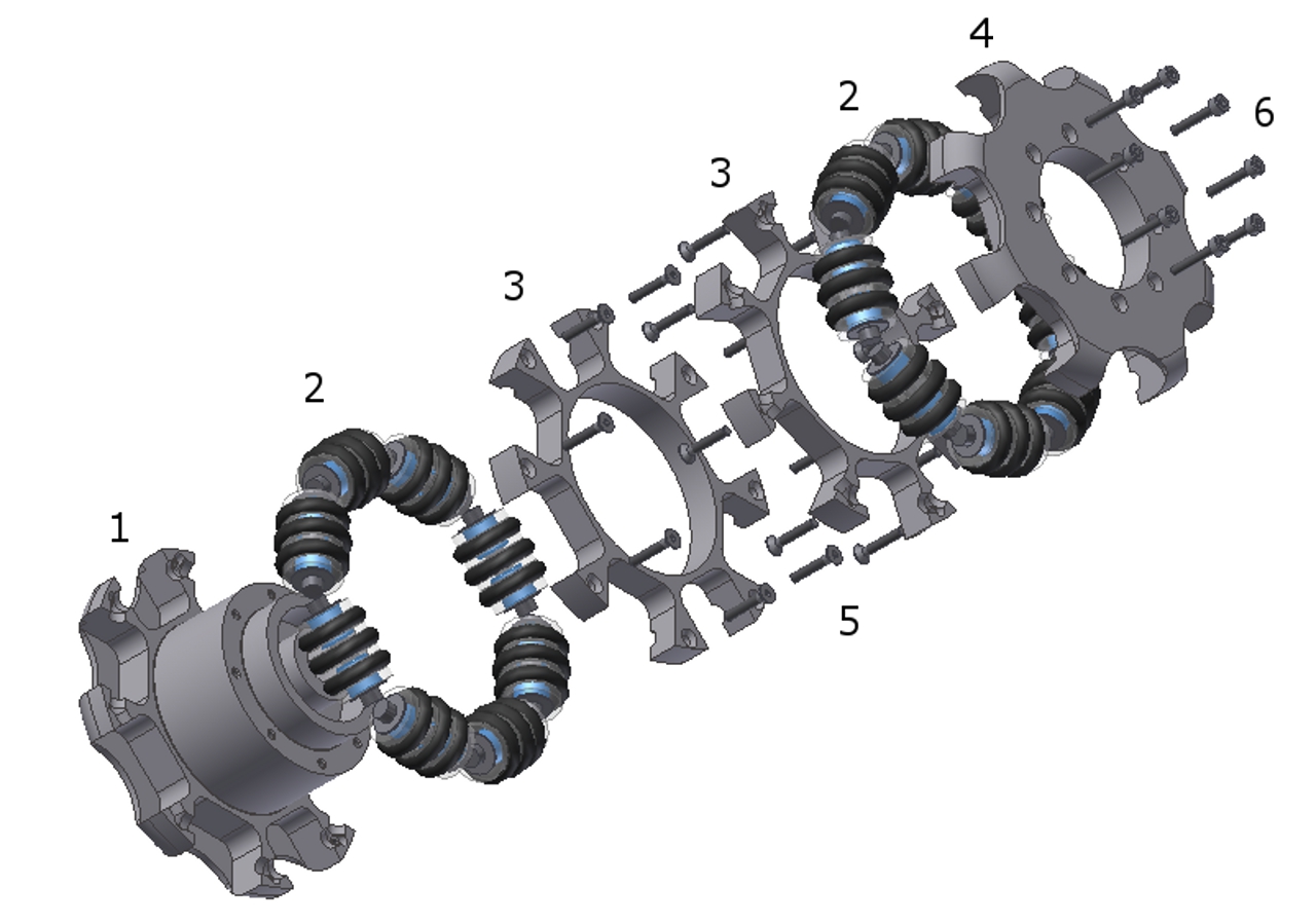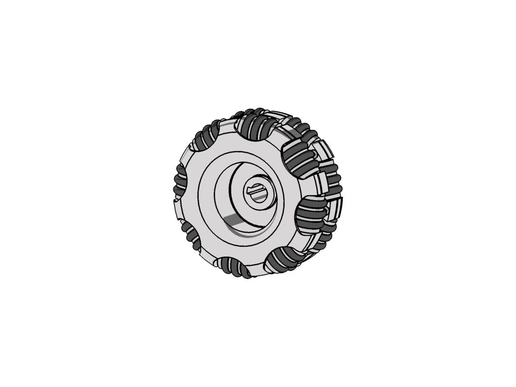 The inner ring (1) from aluminum is used to support two rings of each eight rollers (2). Each ring of rollers (2) is held together using two aluminum rings (3). The left ring of rollers in Figure 5 is bolted with BS 4618 Hexagon sockets (5) on the inner ring (1), while the right ring of rollers is bolted with BS 4618 Hexagon sockets (5) on the aluminum outer ring (4). The total omniwheel is assembled by bolting the outer ring (4) to the innner ring (1) using ISO 4762 M3 x 16 Allen bolts (6).