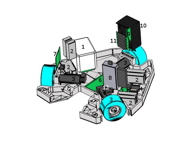 Figure 2 shows the mechanical base frame of the Turtle without electronics. Some components which are found symmetrical in the design are only visualized on one side, in order to give a better view of the design.