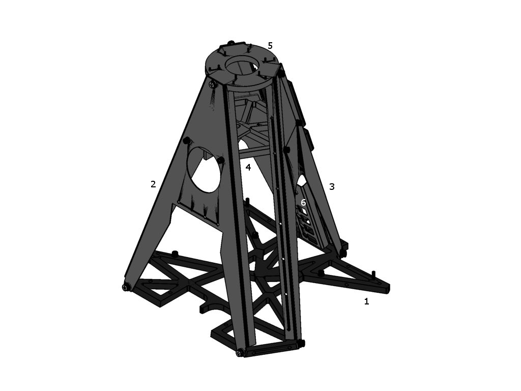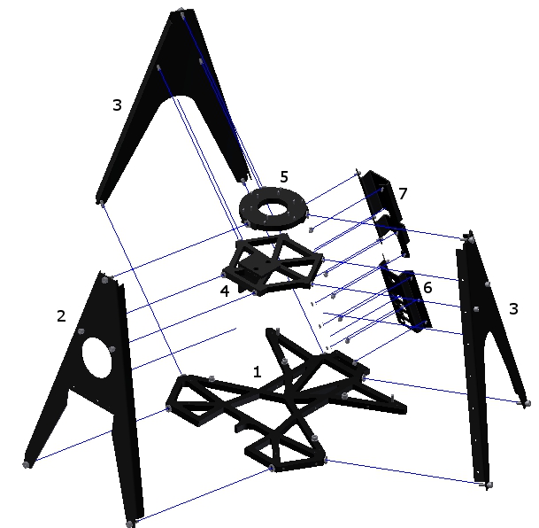 The bottom plate (1) is a milled aluminum (AL51-ST) part and is connected to the three plates of the lower body using bolts. On three sided of this base plate, three bended plates (AL-51ST) are assembled with M5 x12 bolts (ISO 4762) and washers (DIN 125-1A A5 3). One of these is called the front leg (2) and two of them are the side legs (3).