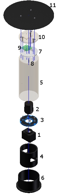 The (1) Prosilica GC750C camera (60 fps at 752x480) is fitted with a (2) Pentax/Cosmicar TS212A lens. The camera is then bolted (ISO 4762 M3 x 8) on a camera mounting disk (3) from AL-51ST, which is again bolted (ISO 4762 M3 x 8) on a camera holder tube (4). The vision tube (5) from plexiglass is fitted around this camera holder tube (4). Around this vision tube (5), again a bushing (6) is fitted in order to hold the vision tube on its place. Both the camera holder tube (4) and bushing (6) are bolted on to the camera disk plate (5 in Figures 3 and 4) using ISO 4762 M3 x 10 bolts.