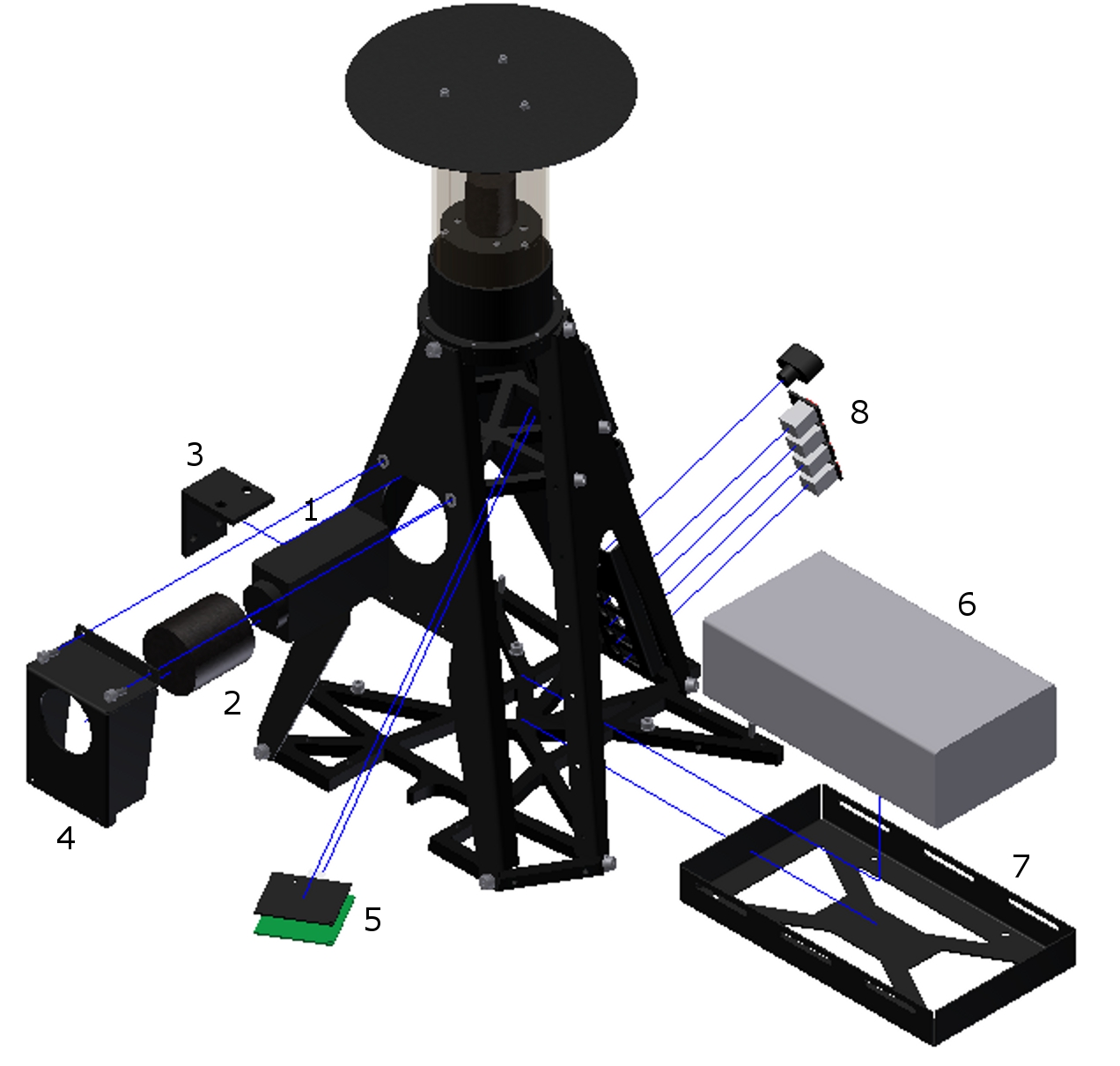 To complete the upper body frame structure, a camera plate (4) from AL51-ST is bolted on the three plates (on which also the front camera can be fixated using a corner profile) together with an omnivision camera disk plate (5) from AL51-ST.
